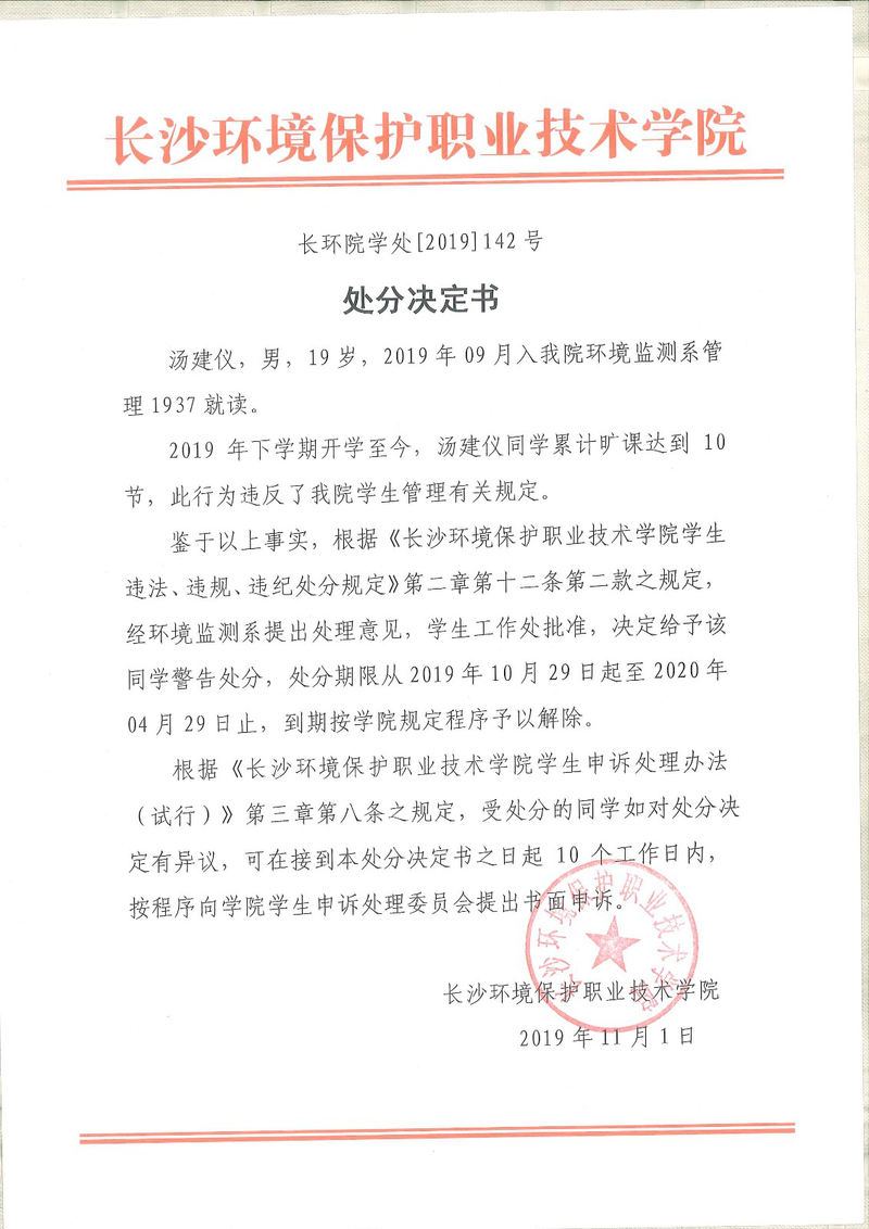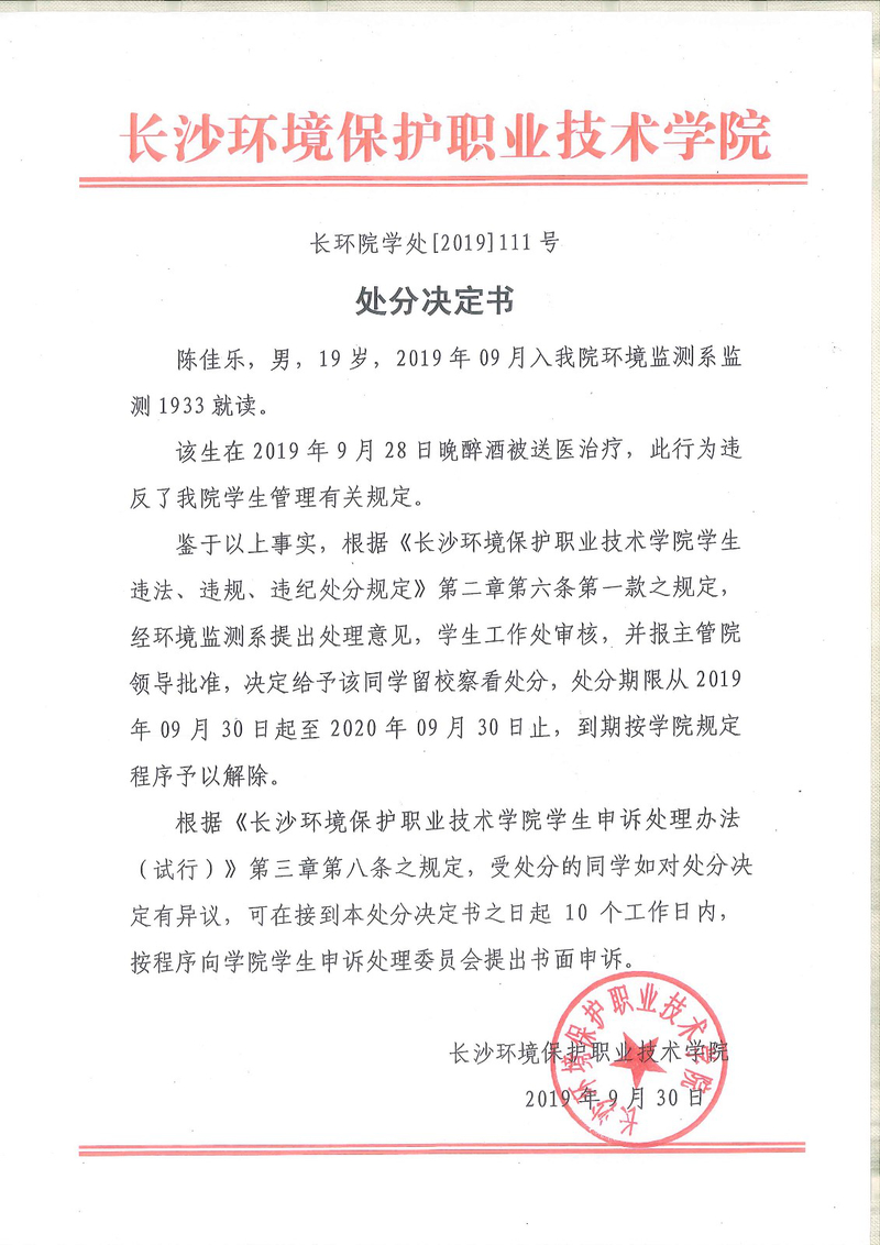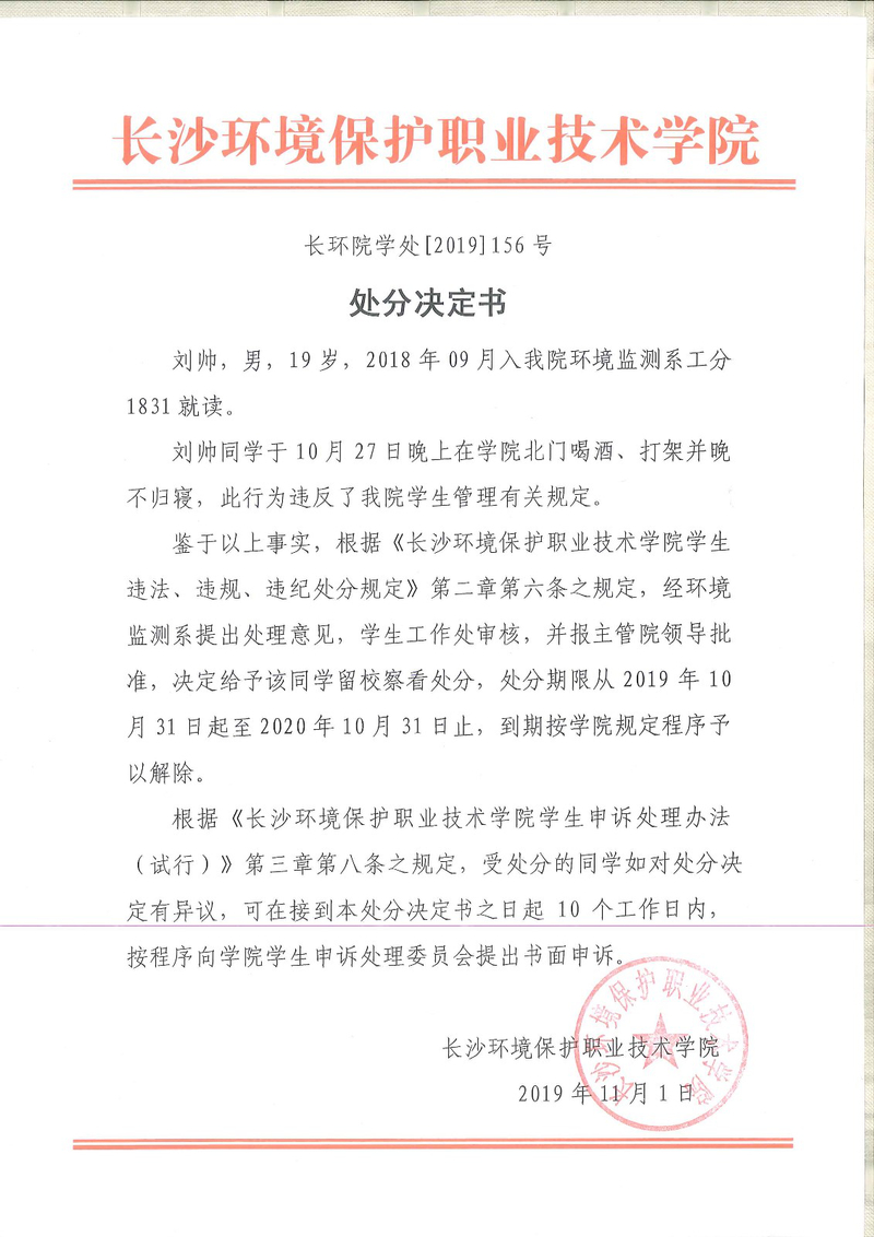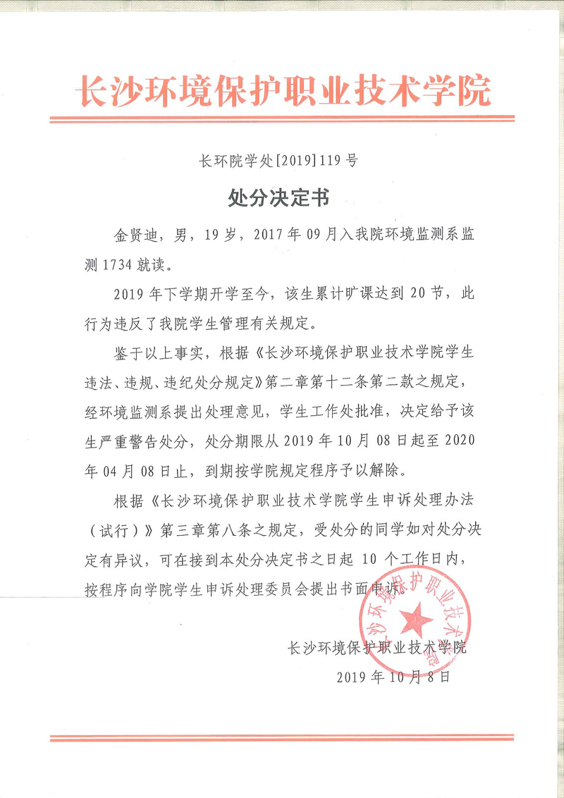 环境监测系关于学生违纪处分决定
