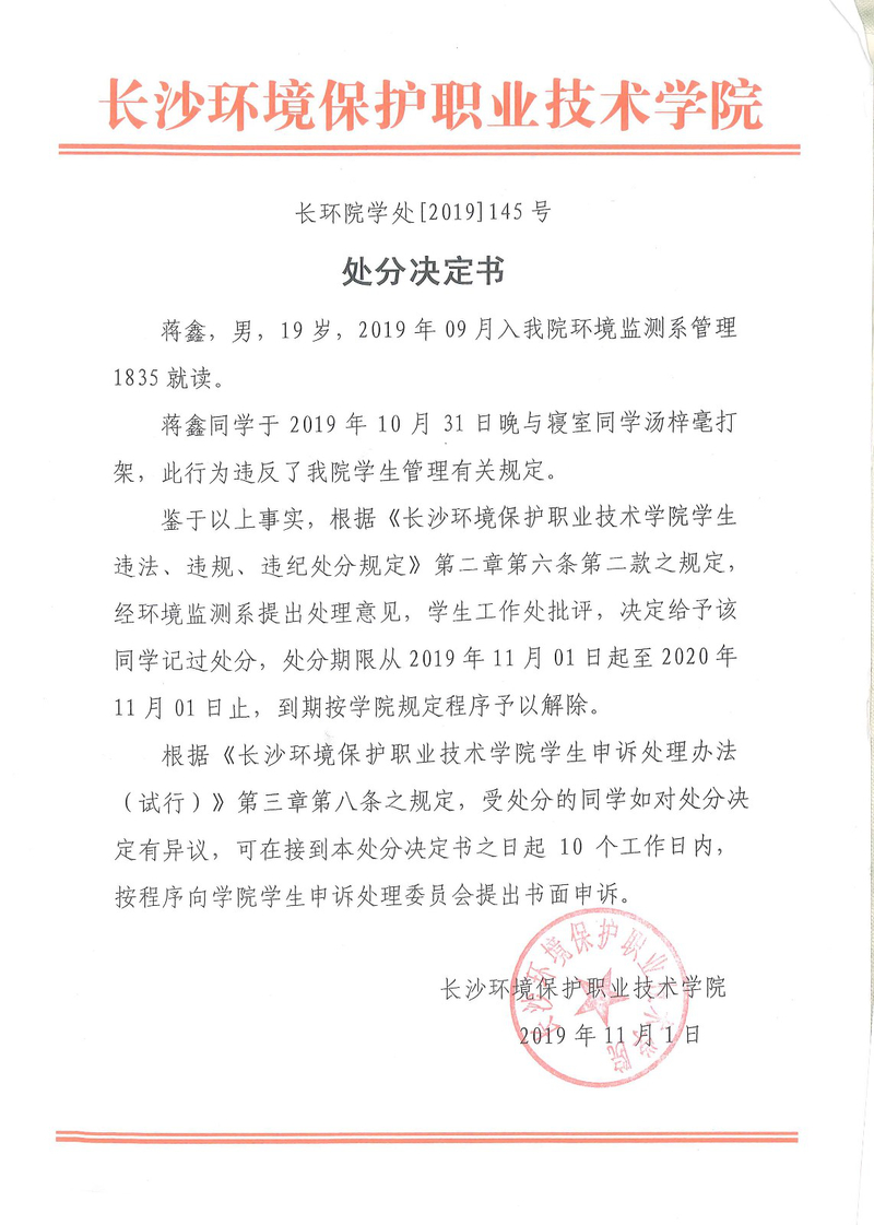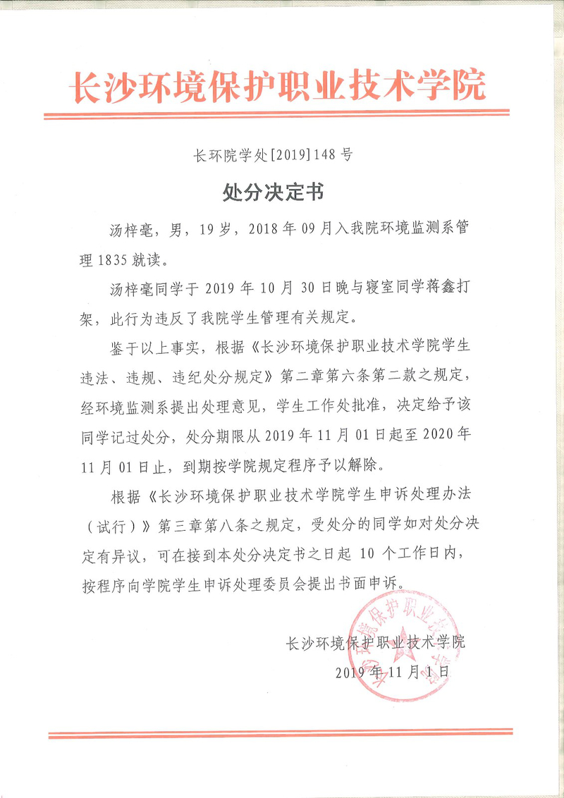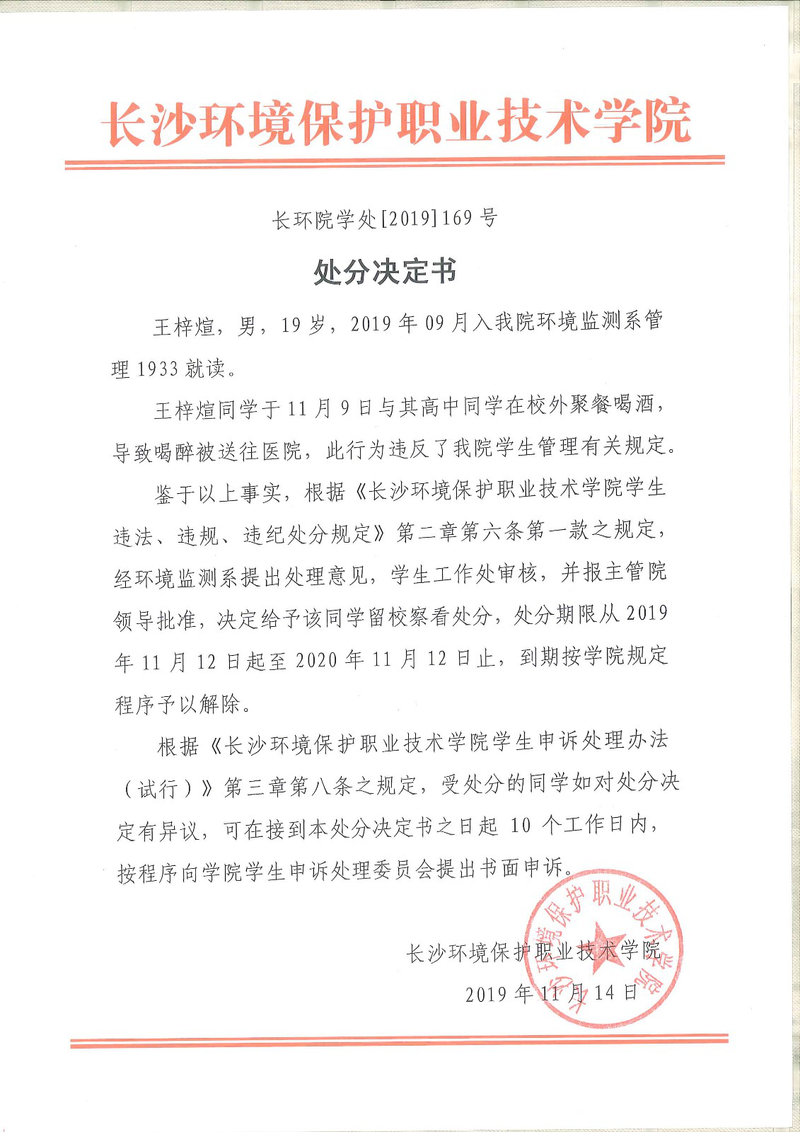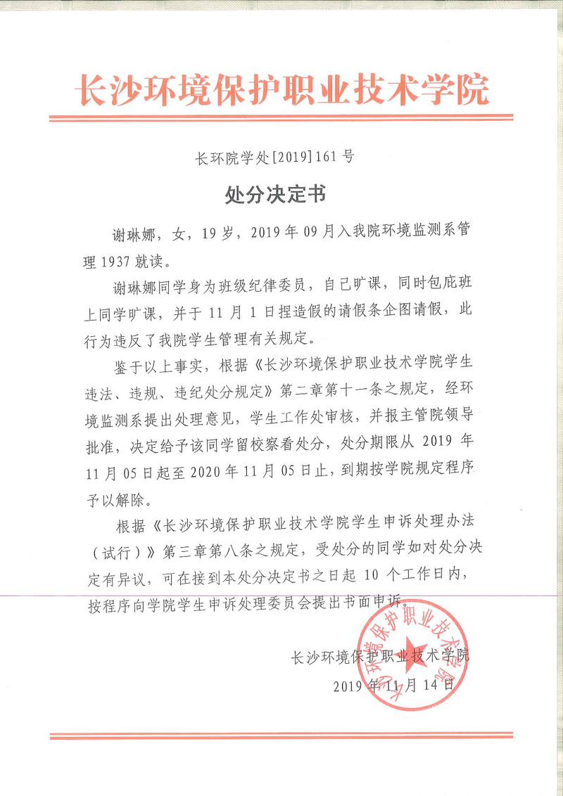 环境监测系关于学生违纪处分决定